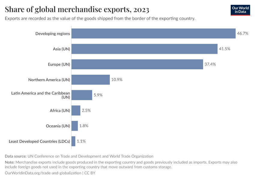 “Data Page: Share of global merchandise exports”. Our World in Data (2026). Data adapted from UN Conference on Trade and Development and World Trade Organization. Retrieved from https://search-sync-local-query.owid.pages.dev/grapher/share-of-global-merchandise-exports [online resource]How to cite this data