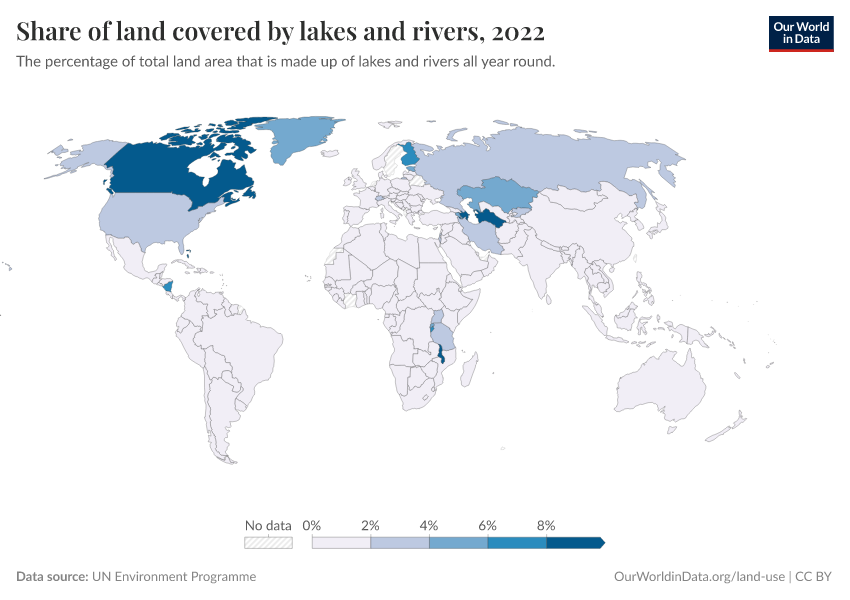 “Data Page: Share of land covered by lakes and rivers”. Our World in Data (2026). Data adapted from UN Environment Programme. Retrieved from https://search-sync-local-query.owid.pages.dev/grapher/share-of-land-covered-by-lakes-and-rivers [online resource]How to cite this data