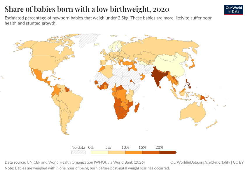 “Data Page: Share of babies born with a low birthweight”. Our World in Data (2026). Data adapted from UNICEF and World Health Organization (WHO), via World Bank. Retrieved from https://search-sync-local-query.owid.pages.dev/grapher/share-of-low-birthweight-babies-born [online resource]How to cite this data