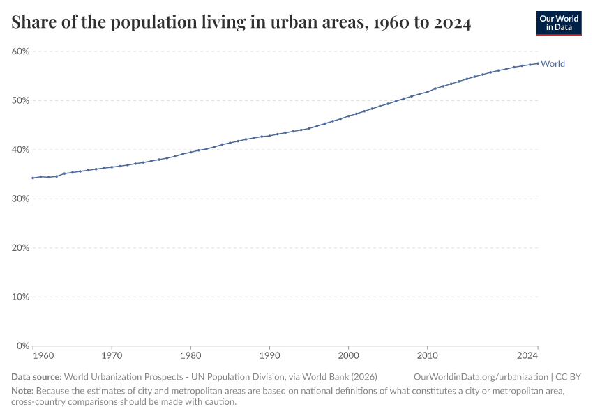 “Data Page: Share of the population living in urban areas”. Our World in Data (2026). Data adapted from World Urbanization Prospects - UN Population Division, via World Bank. Retrieved from https://search-sync-local-query.owid.pages.dev/grapher/share-of-population-urban [online resource]How to cite this data