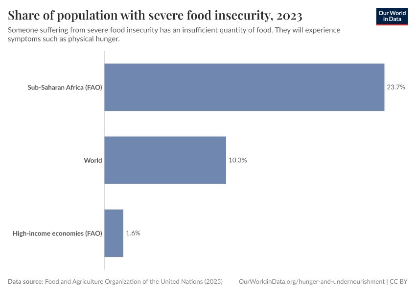 Food and Agriculture Organization of the United Nations (2024) – with major processing by Our World in Data. “Prevalence of severe food insecurity in the total population – UN FAO – 3-year average” [dataset]. Food and Agriculture Organization of the United Nations, “Food Security and Nutrition: Suite of Food Security Indicators” [original data]. Retrieved January 5, 2026 from https://search-sync-local-query.owid.pages.dev/grapher/share-of-population-with-severe-food-insecurity