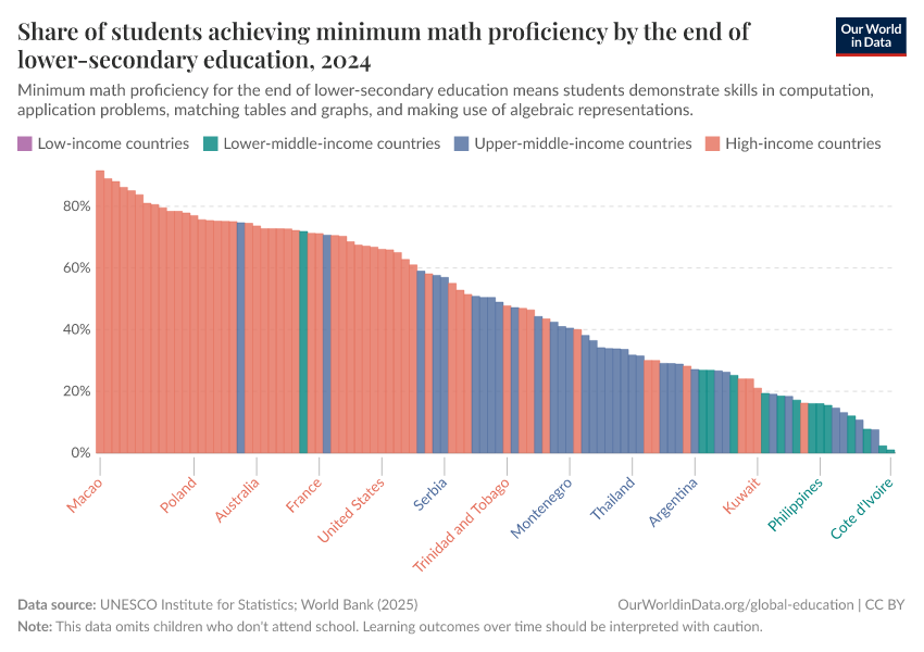 UNESCO Institute for Statistics – processed by Our World in Data. “Share of students achieving minimum math proficiency by the end of lower-secondary education” [dataset]. UNESCO Institute for Statistics, “Data from multiple sources” [original data]. Retrieved January 5, 2026 from https://search-sync-local-query.owid.pages.dev/grapher/share-of-students-at-end-of-lower-secondary-education-achieving-minimum-math-proficiency