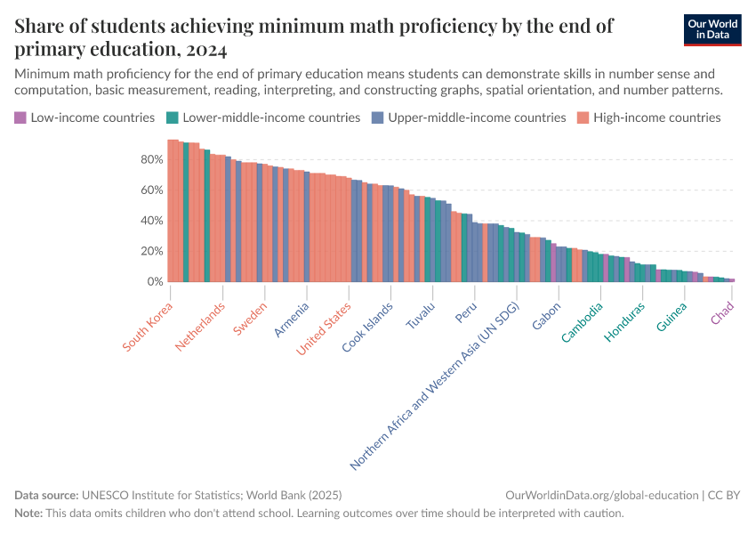 “Data Page: Share of students achieving minimum math proficiency by the end of primary education”. Our World in Data (2026). Data adapted from UNESCO Institute for Statistics. Retrieved from https://search-sync-local-query.owid.pages.dev/grapher/share-of-students-at-end-of-primary-education-achieving-minimum-math-proficiency [online resource]How to cite this data