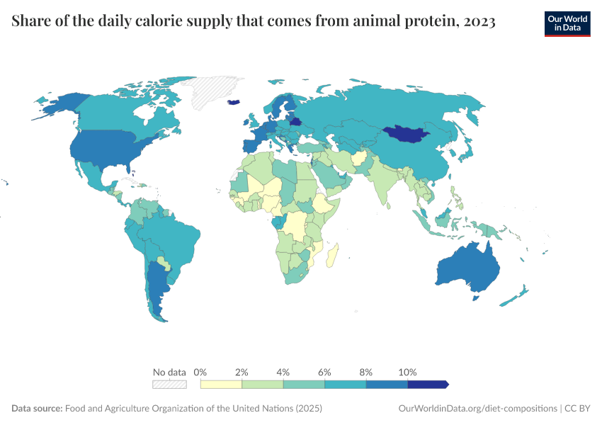 “Data Page: Share of the daily calorie supply that comes from animal protein”, part of the following publication: Hannah Ritchie, Pablo Rosado, and Max Roser (2023) - “Agricultural Production”. Data adapted from Food and Agriculture Organization of the United Nations. Retrieved from https://search-sync-local-query.owid.pages.dev/grapher/share-of-the-daily-calorie-supply-that-comes-from-animal-protein [online resource]How to cite this data