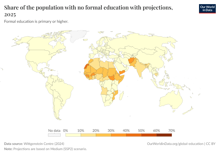 “Data Page: Share of the population with no formal education with projections”, part of the following publication: Hannah Ritchie, Veronika Samborska, Natasha Ahuja, Esteban Ortiz-Ospina, and Max Roser (2023) - “Global Education”. Data adapted from Wittgenstein Centre. Retrieved from https://search-sync-local-query.owid.pages.dev/grapher/share-of-the-population-with-no-formal-education-with-projections [online resource]How to cite this data