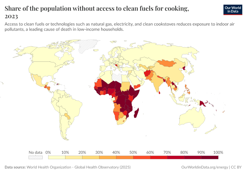 World Health Organization - Global Health Observatory (2025) – processed by Our World in Data. “Share of the population without access to clean fuels for cooking” [dataset]. World Health Organization, “Global Health Observatory” [original data]. Retrieved January 5, 2026 from https://search-sync-local-query.owid.pages.dev/grapher/share-of-the-population-without-access-to-clean-fuels-for-cooking