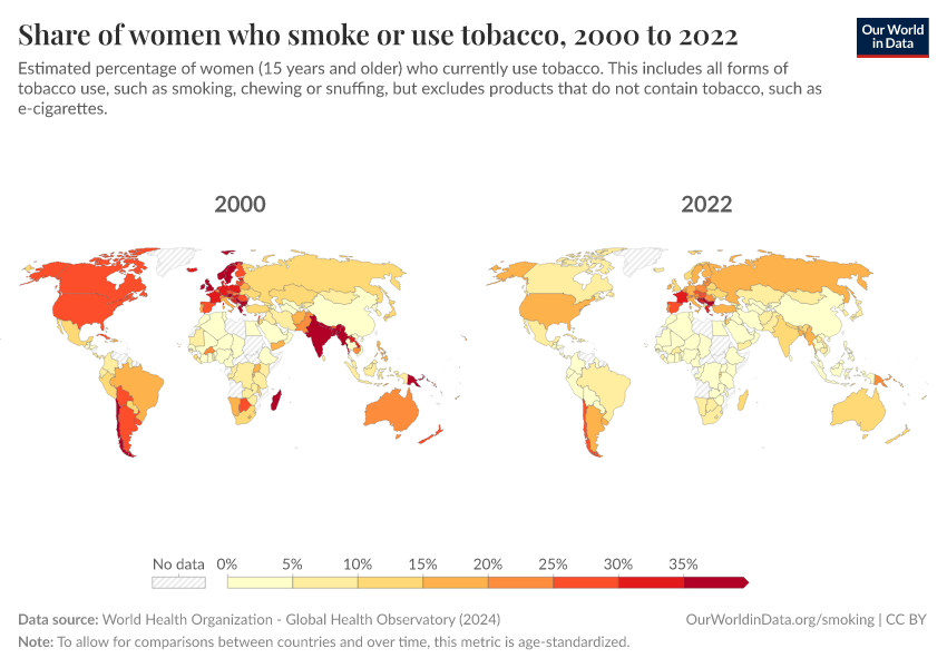 World Health Organization - Global Health Observatory (2024) – processed by Our World in Data. “Share of women who smoke or use tobacco” [dataset]. World Health Organization, “Global Health Observatory” [original data]. Retrieved January 5, 2026 from https://search-sync-local-query.owid.pages.dev/grapher/share-of-women-who-are-smoking