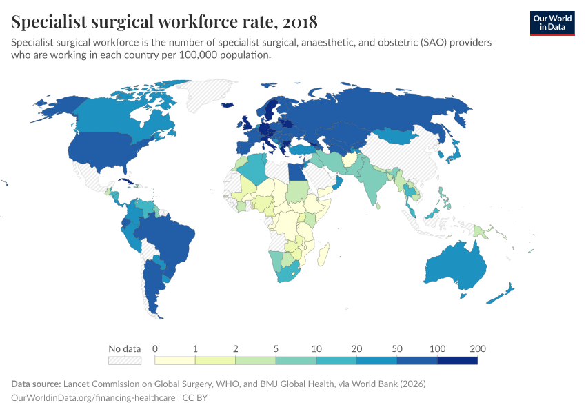 Lancet Commission on Global Surgery, WHO, and BMJ Global Health, via World Bank (2025) – processed by Our World in Data. “Specialist surgical workforce rate” [dataset]. Lancet Commission on Global Surgery, WHO, and BMJ Global Health, via World Bank, “World Development Indicators 122” [original data]. Retrieved January 5, 2026 from https://search-sync-local-query.owid.pages.dev/grapher/surgeons-per-100000