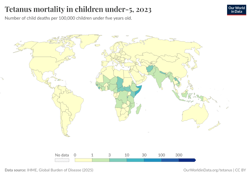 IHME, Global Burden of Disease (2024) – with minor processing by Our World in Data. “Tetanus mortality in children under-5” [dataset]. IHME, Global Burden of Disease, “Global Burden of Disease - Deaths and DALYs” [original data]. Retrieved January 5, 2026 from https://search-sync-local-query.owid.pages.dev/grapher/tetanus-mortality-in-children-under-5