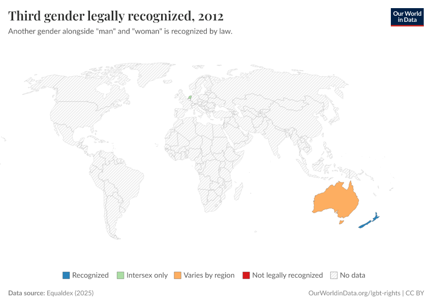 “Data Page: Third gender legally recognized”, part of the following publication: Bastian Herre and Pablo Arriagada (2023) - “LGBT+ Rights”. Data adapted from Equaldex. Retrieved from https://search-sync-local-query.owid.pages.dev/grapher/third-gender-recognition-equaldex [online resource]