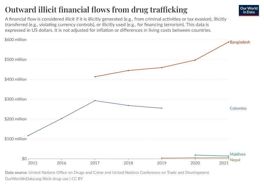 United Nations Office on Drugs and Crime and United Nations Conference on Trade and Development – processed by Our World in Data. “Outward illicit financial flows from drug trafficking” [dataset]. United Nations Office on Drugs and Crime and United Nations Conference on Trade and Development, “Data from multiple sources” [original data]. Retrieved January 5, 2026 from https://search-sync-local-query.owid.pages.dev/grapher/total-outward-financial-flows-from-drug-trafficking