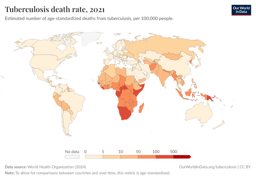 World Health Organization (2024) – with major processing by Our World in Data. “Tuberculosis death rate” [dataset]. World Health Organization, “Global Health Estimates” [original data]. Retrieved January 5, 2026 from https://search-sync-local-query.owid.pages.dev/grapher/tuberculosis-death-rate-age-standardized