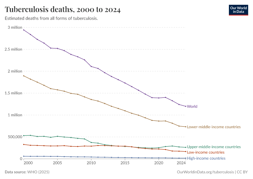 WHO (2024) – with minor processing by Our World in Data. “Tuberculosis deaths” [dataset]. WHO, “Global Tuberculosis Report - Burden Estimates” [original data]. Retrieved January 5, 2026 from https://search-sync-local-query.owid.pages.dev/grapher/tuberculosis-deaths-who