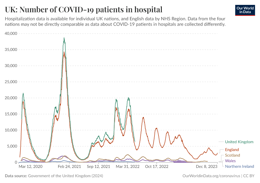Government of the United Kingdom (2024) – with minor processing by Our World in Data. “UK: Number of COVID-19 patients in hospital” [dataset]. Government of the United Kingdom, “UKHSA data dashboard” [original data]. Retrieved January 5, 2026 from https://search-sync-local-query.owid.pages.dev/grapher/uk-covid-hospital-patients