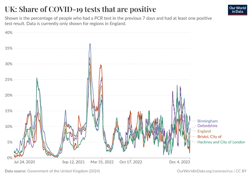 Government of the United Kingdom (2024) – with minor processing by Our World in Data. “UK: Share of COVID-19 tests that are positive” [dataset]. Government of the United Kingdom, “UKHSA data dashboard” [original data]. Retrieved January 5, 2026 from https://search-sync-local-query.owid.pages.dev/grapher/uk-covid-positivity