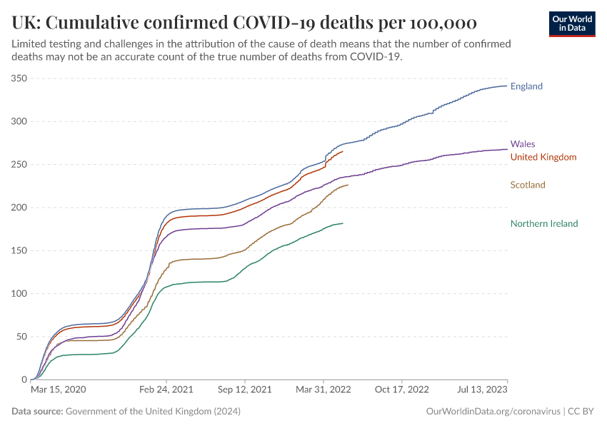 Government of the United Kingdom (2024) – with minor processing by Our World in Data. “UK: Cumulative confirmed COVID-19 deaths per 100,000” [dataset]. Government of the United Kingdom, “UKHSA data dashboard” [original data]. Retrieved January 5, 2026 from https://search-sync-local-query.owid.pages.dev/grapher/uk-cumulative-covid-deaths-rate