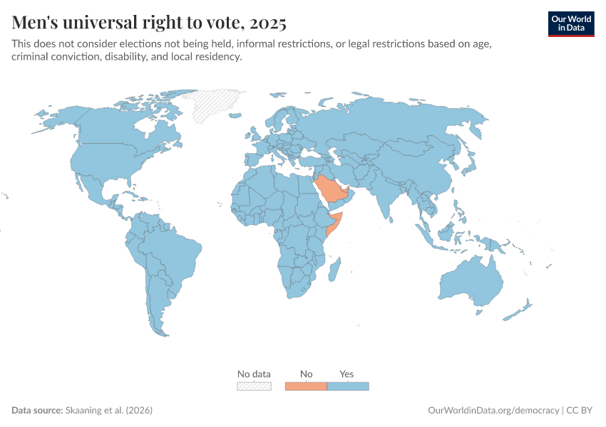 “Data Page: Men's universal right to vote”, part of the following publication: Bastian Herre, Lucas Rodés-Guirao, and Esteban Ortiz-Ospina (2013) - “Democracy”. Data adapted from Skaaning et al.. Retrieved from https://search-sync-local-query.owid.pages.dev/grapher/universal-suffrage-men-lexical [online resource]How to cite this data