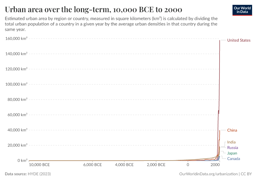 “Data Page: Urban area over the long-term”, part of the following publication: Hannah Ritchie, Lucas Rodés-Guirao, Edouard Mathieu, Marcel Gerber, Esteban Ortiz-Ospina, Joe Hasell, and Max Roser (2023) - “Population Growth”. Data adapted from PBL Netherlands Environmental Assessment Agency. Retrieved from https://search-sync-local-query.owid.pages.dev/grapher/urban-area-long-term [online resource]How to cite this data