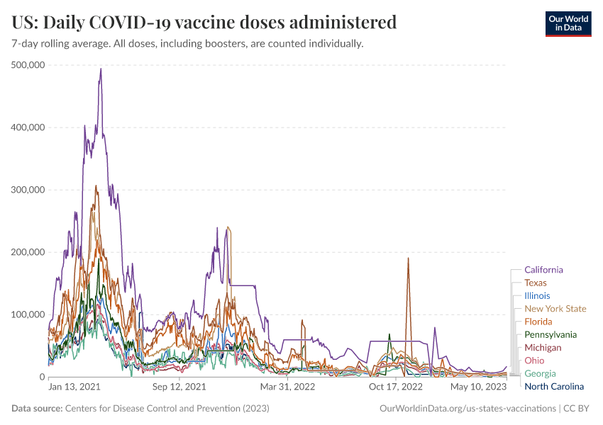 Centers for Disease Control and Prevention (2023) – processed by Our World in Data. “US: Daily COVID-19 vaccine doses administered” [dataset]. Centers for Disease Control and Prevention, “COVID-19, Vaccinations (United States)” [original data]. Retrieved January 5, 2026 from https://search-sync-local-query.owid.pages.dev/grapher/us-daily-covid-vaccine-doses-administered
