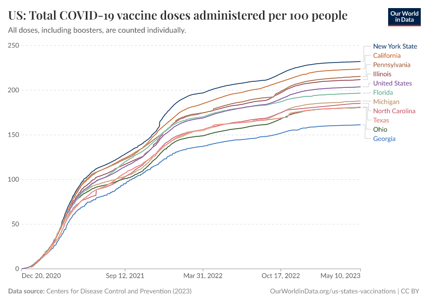 Centers for Disease Control and Prevention (2023) – processed by Our World in Data. “US: Total COVID-19 vaccine doses administered per 100 people” [dataset]. Centers for Disease Control and Prevention, “COVID-19, Vaccinations (United States)” [original data]. Retrieved January 5, 2026 from https://search-sync-local-query.owid.pages.dev/grapher/us-state-covid-vaccines-per-100