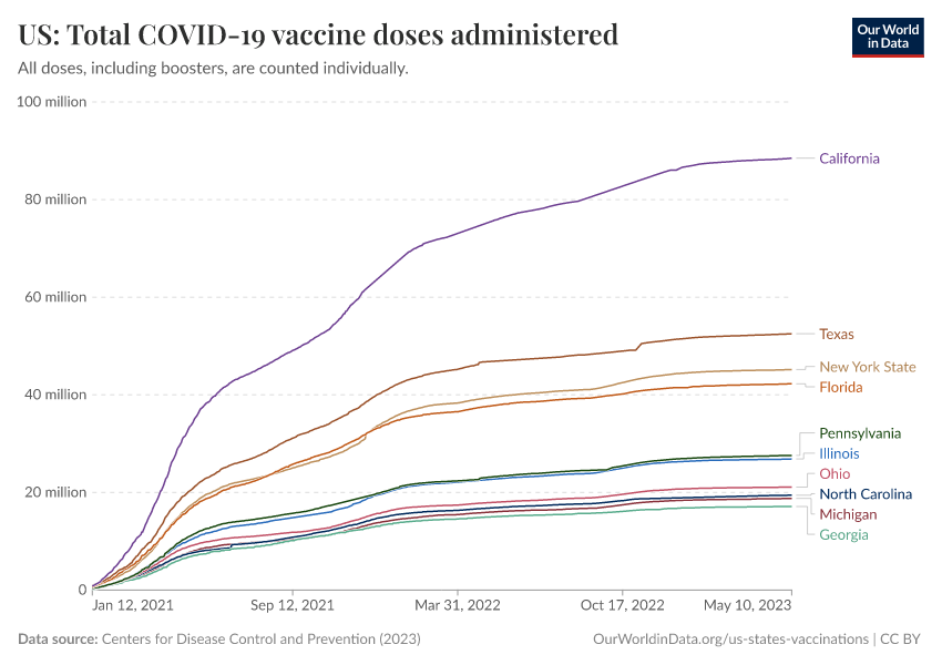 Centers for Disease Control and Prevention (2023) – processed by Our World in Data. “US: Total COVID-19 vaccine doses administered” [dataset]. Centers for Disease Control and Prevention, “COVID-19, Vaccinations (United States)” [original data]. Retrieved January 5, 2026 from https://search-sync-local-query.owid.pages.dev/grapher/us-total-covid-19-vaccine-doses-administered
