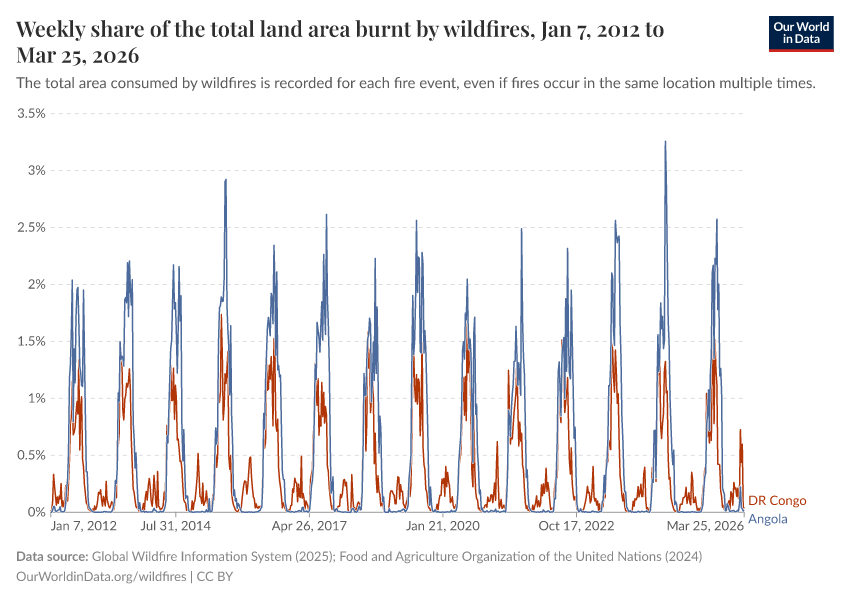 “Data Page: Weekly share of the total land area burnt by wildfires”, part of the following publication: Hannah Ritchie, Pablo Rosado, and Veronika Samborska (2024) - “Climate Change”. Data adapted from Global Wildfire Information System, Food and Agriculture Organization of the United Nations. Retrieved from https://search-sync-local-query.owid.pages.dev/grapher/weekly-share-of-the-total-land-area-burnt-by-wildfires [online resource]How to cite this data