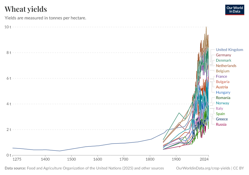 Food and Agriculture Organization of the United Nations (2025); Broadberry et al. (2015); Brassley (2000); Bayliss-Smith & Wanmali (1984) – with major processing by Our World in Data. “Wheat yields” [dataset]. Food and Agriculture Organization of the United Nations, “Production: Crops and livestock products”; Broadberry et al., “Long-term crop yields in UK”; Brassley, “Long-term crop yields in UK”; Bayliss-Smith & Wanmali, “Understanding Green Revolutions” [original data]. Retrieved January 5, 2026 from https://search-sync-local-query.owid.pages.dev/grapher/wheat-yields