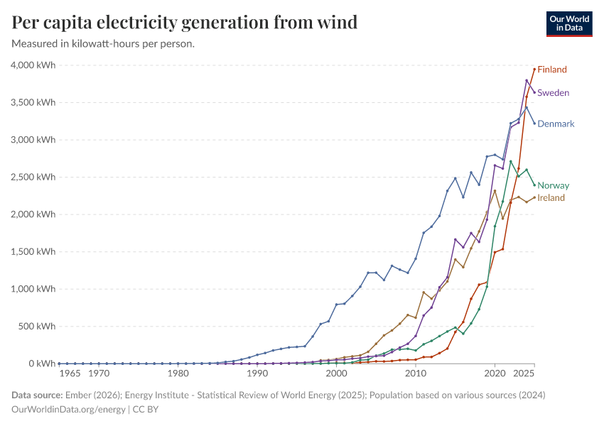 Ember (2025); Energy Institute - Statistical Review of World Energy (2025); Population based on various sources (2024) – with major processing by Our World in Data. “Electricity generation from wind power per person” [dataset]. Ember, “Yearly Electricity Data Europe”; Ember, “Yearly Electricity Data”; Energy Institute, “Statistical Review of World Energy”; Various sources, “Population” [original data]. Retrieved January 5, 2026 from https://search-sync-local-query.owid.pages.dev/grapher/wind-electricity-per-capita