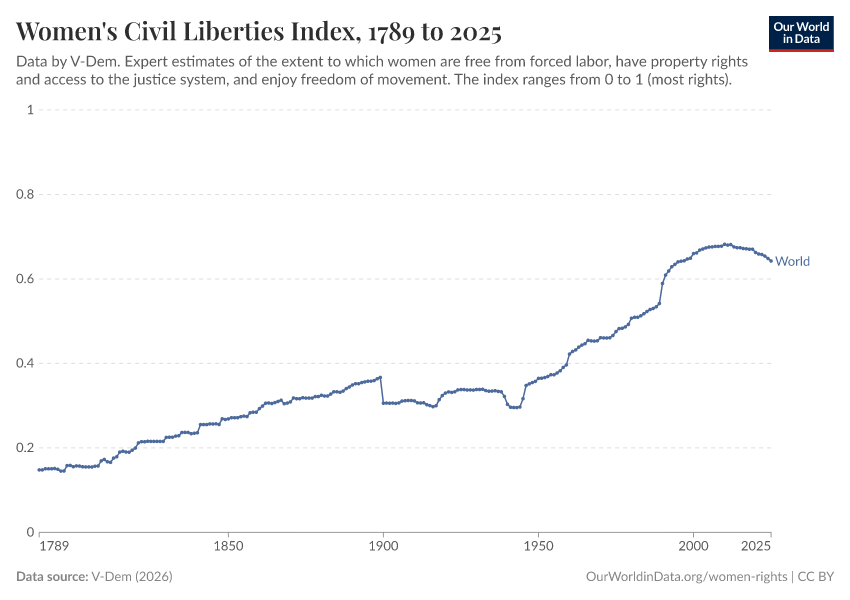 V-Dem (2025) – processed by Our World in Data. “Women's civil rights index – V-Dem” [dataset]. V-Dem, “Democracy report v15” [original data]. Retrieved January 5, 2026 from https://search-sync-local-query.owid.pages.dev/grapher/women-civil-liberties-index