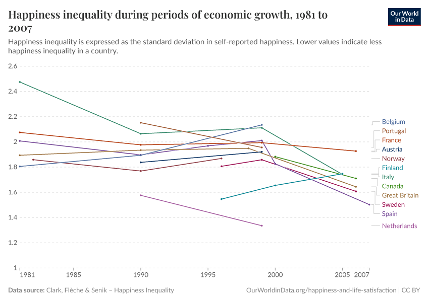 The results from Stevenson and Wolfers are consistent with other studies looking at changes of happiness inequality (or life satisfaction inequality) over time. In particular, researchers have noted that there is a correlation between economic growth and reductions in happiness inequality—even when income inequality is increasing at the same time. The visualization here uses data from Clark, Fleche, and Senik (2015)6 shows this. It plots the evolution of happiness inequality within a selection of rich countries that experienced uninterrupted GDP growth.