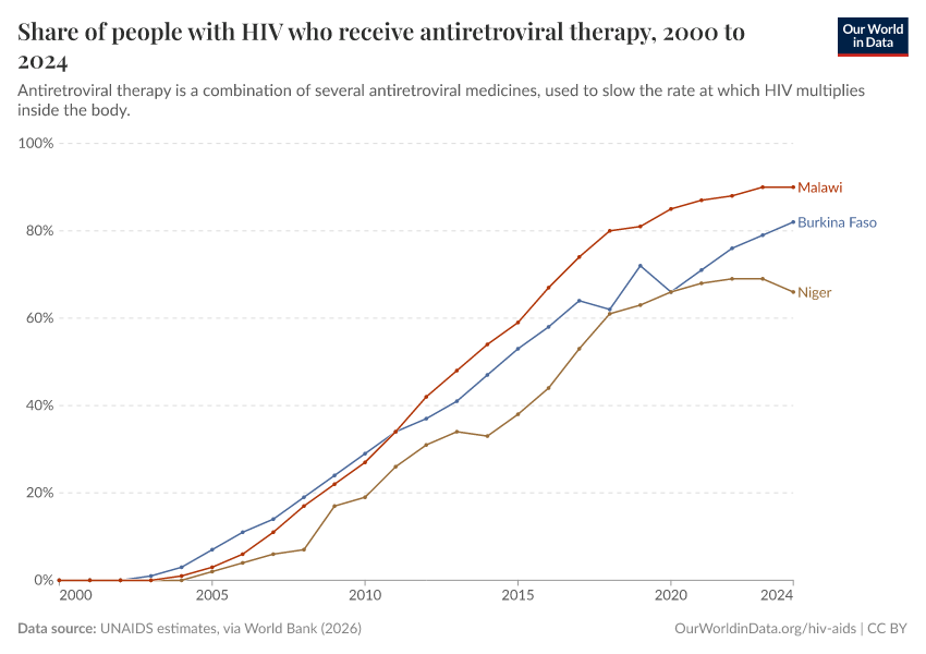 In the chart below, you can see the rise in the share of people with HIV who receive antiretroviral therapy, a lifesaving intervention against HIV/AIDS.