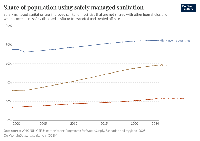In the chart below, you can see share who use safely-managed sanitation, which has risen gradually over time.