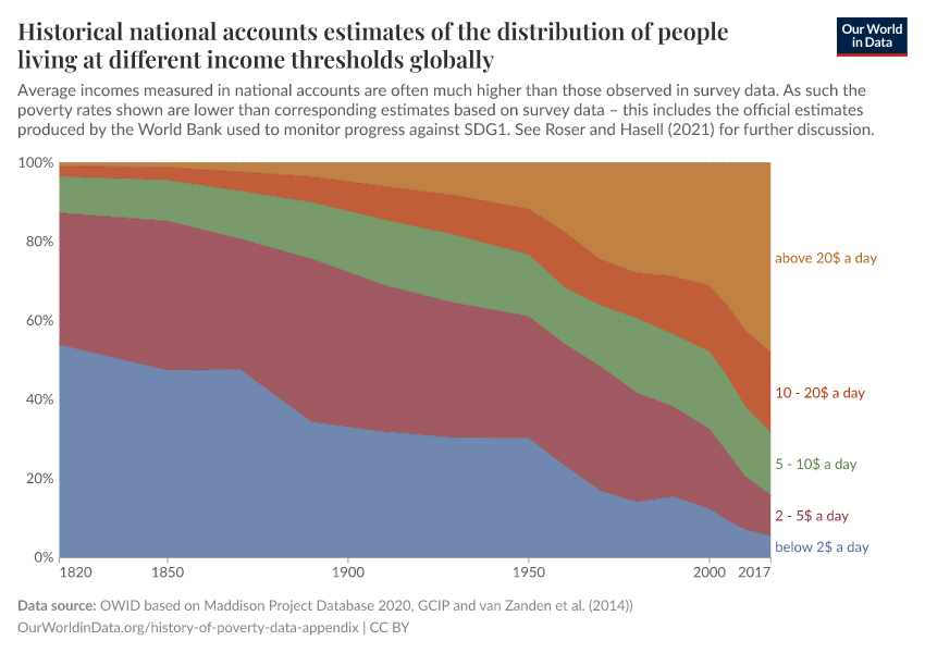It joins recent World Bank estimates of the share of people globally living below $1.90 a day from 1980, with our own historical national accounts estimates using a poverty line of $5.20. For a discussion of these two approaches to estimating poverty and how they relate to one another see the main paper.