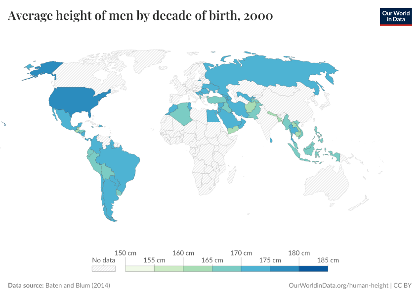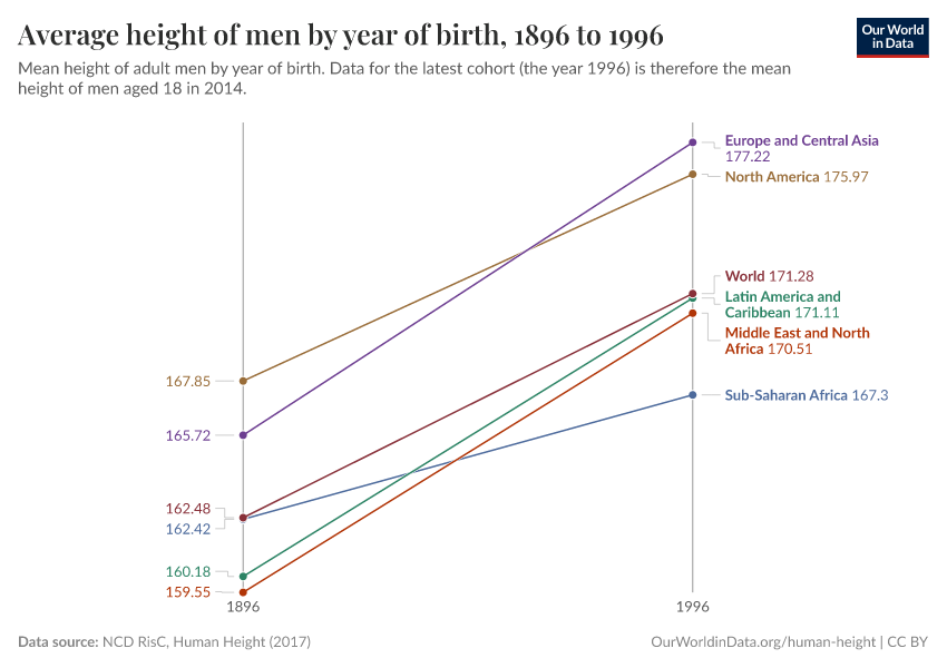 The data shown here comes from a global study, published by the NCD Risk Factor Collaboration (NCD-RisC) in 2016.4 This dataset is based on both demographic and health surveys as well as academic studies. It reports the estimated average (mean) height for adults by their year of birth, meaning that it only includes estimates for those who have reached the age of 18.