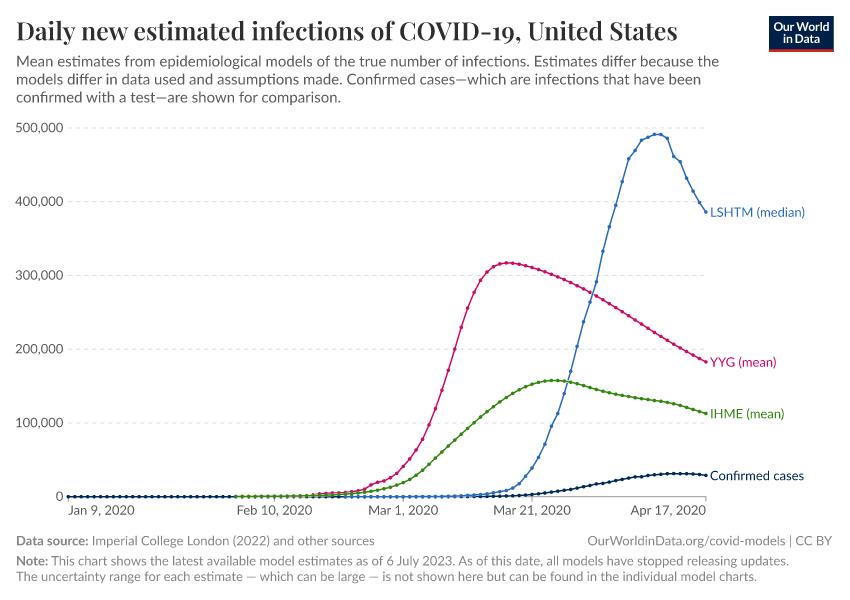 The chart below compares the number of confirmed cases to different estimates of the true number of infections.