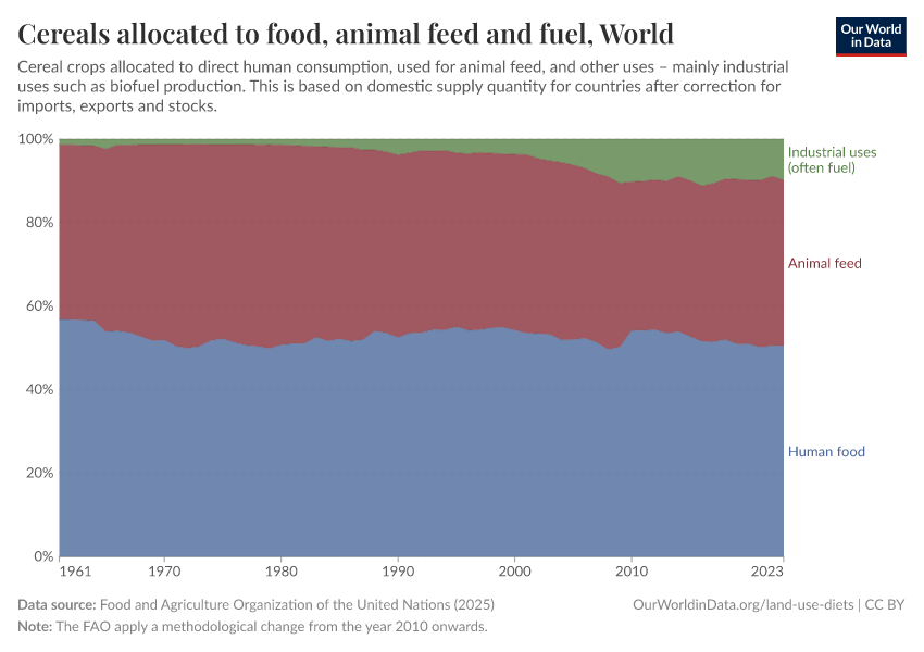 In the chart, we see the breakdown of what the world’s cereals are used for. This is split into three categories: direct human food (the rice, oats, wheat, bread, etc. that we eat); animal feed; and industrial uses (mainly biofuels).