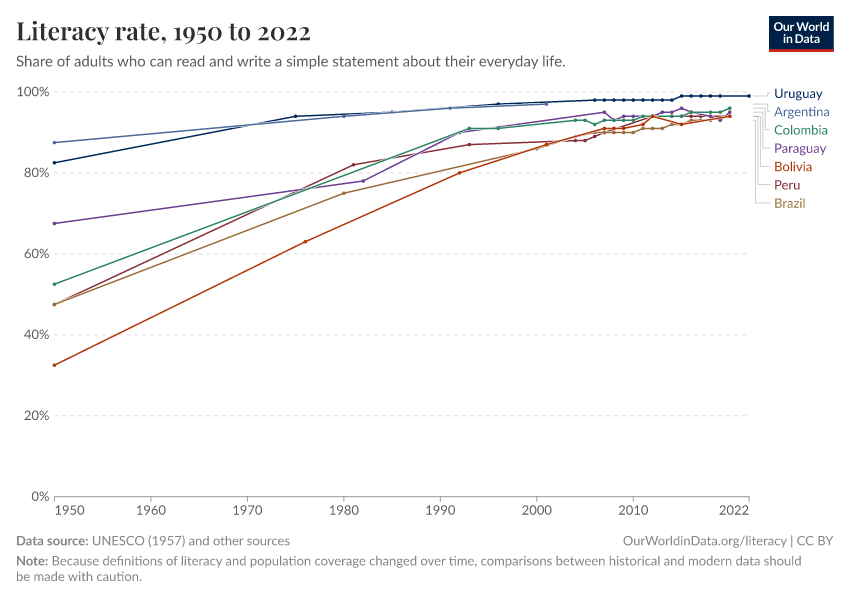 As pointed out above, Europe pioneered the expansion of basic education – but global literacy rates only started really climbing in the second half of the 20th century, when the expansion of basic education became a global priority. Here, we present evidence of important recent achievements in Latin America, where literacy has dramatically increased in the past century.