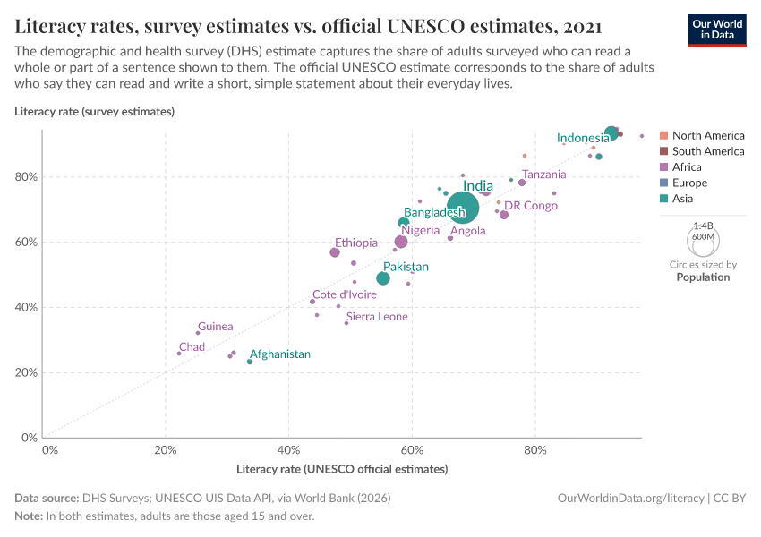 In the chart, we present a breakdown of UNESCO literacy estimates, showing the main methodologies used and how these have changed over time. (To explore changes across time, use the slider underneath the map.)