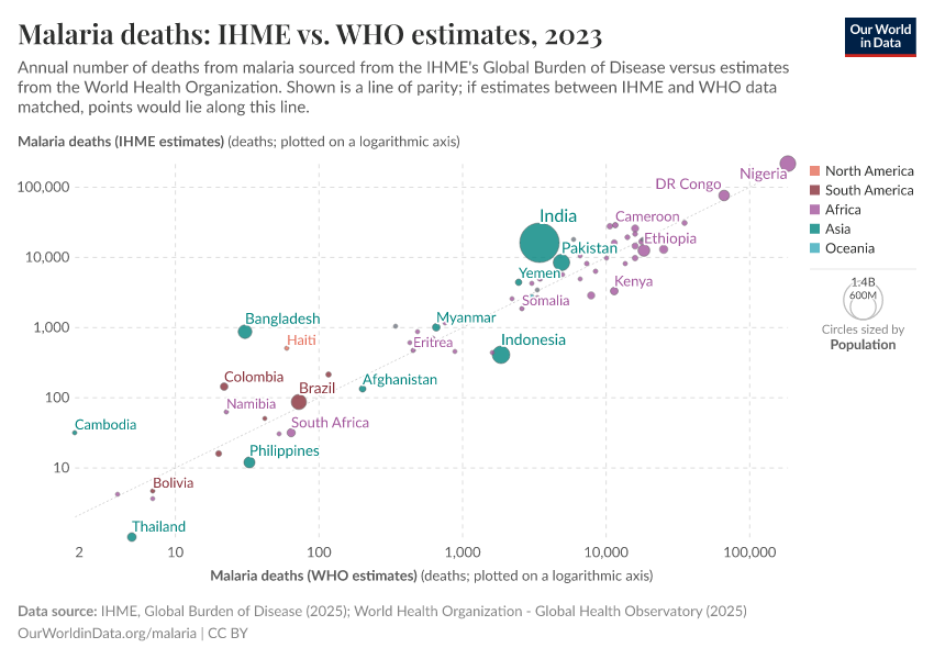 These estimates are notably higher than those of the WHO. Although divergent on the total number of malaria deaths, both the IHME and WHO estimate that the vast majority of deaths are in the African region.