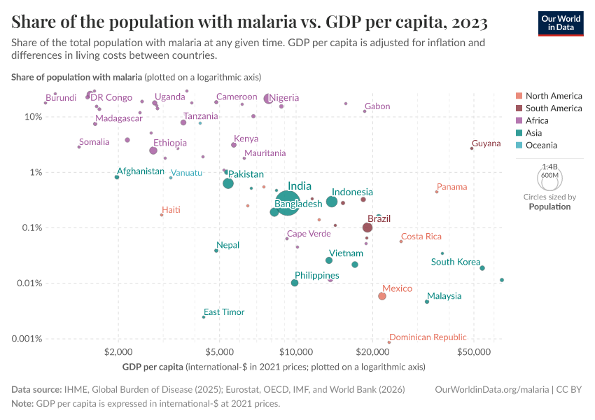 In the chart below, you can see each country’s prevalence of malaria compared to their GDP per capita.