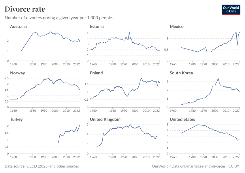 As we see in the chart, divorce rates increased markedly in many countries between the 1970s and 1990s. In the UK, Norway, and South Korea, divorce rates more than tripled.