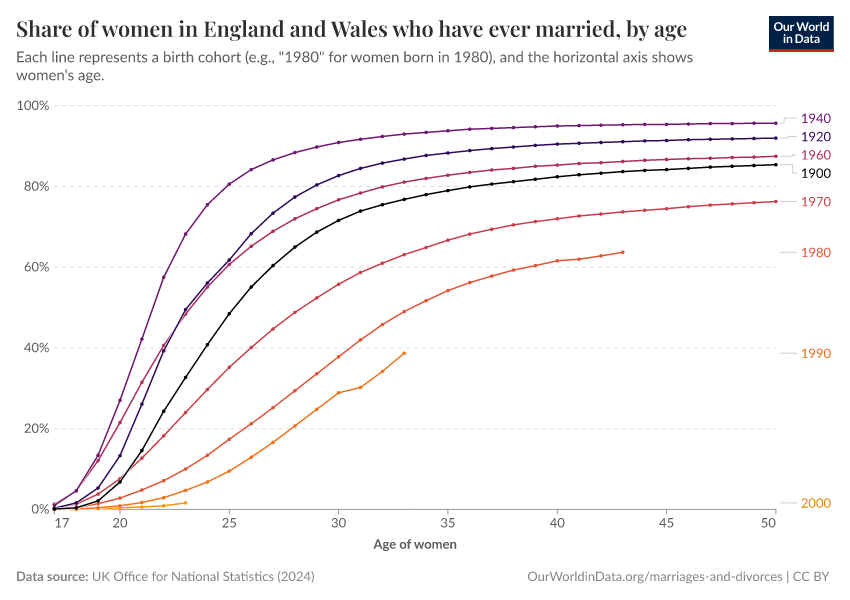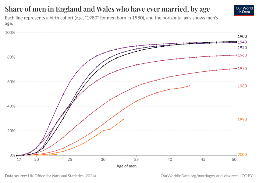 Some countries have statistical records going back several generations, which allow us to estimate marriage rates by age and year of birth. The charts here show this data for women and men born in England and Wales as early as 1900.