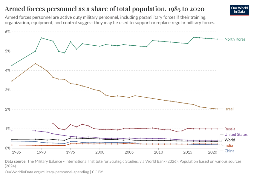 The last chart plots armed forces personnel across countries and world regions. Again there is a broad negative trend in most countries. And these trends also hold if we look at the armed forces as share of labor force.