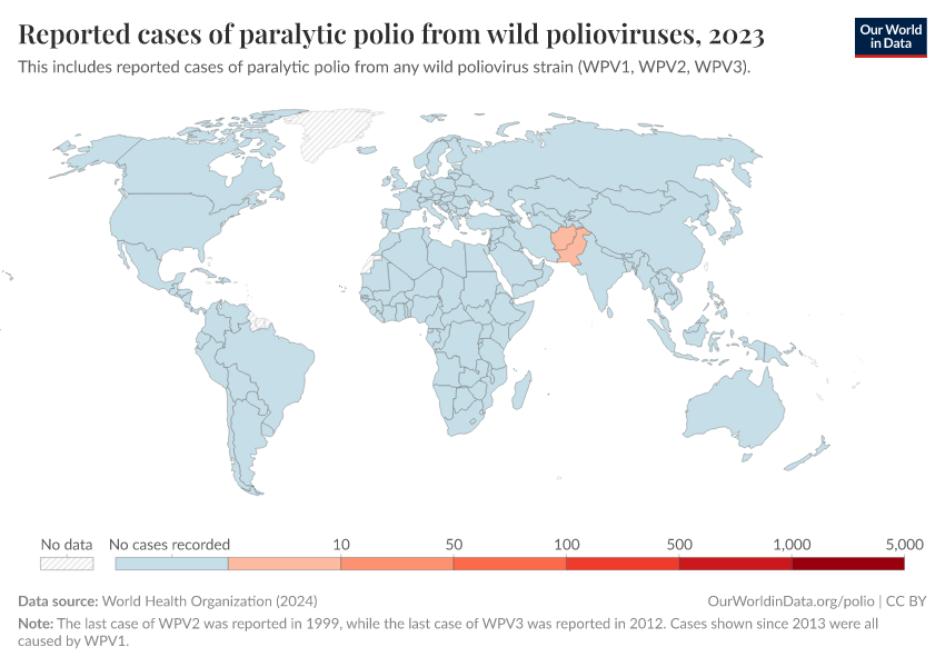 But as the chart shows, the number of cases is now very low. In 2023, only six cases of wild polio were reported in Afghanistan and another six in Pakistan.