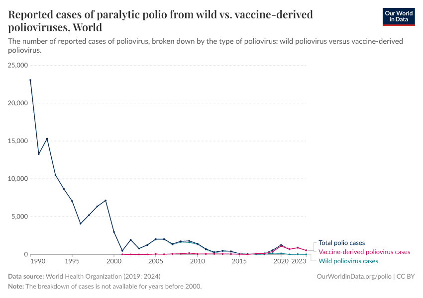 Although the absolute number of cases is much lower than in the past, most cases recently have come from vaccine-derived polioviruses (VDPVs), as shown in the chart below.5