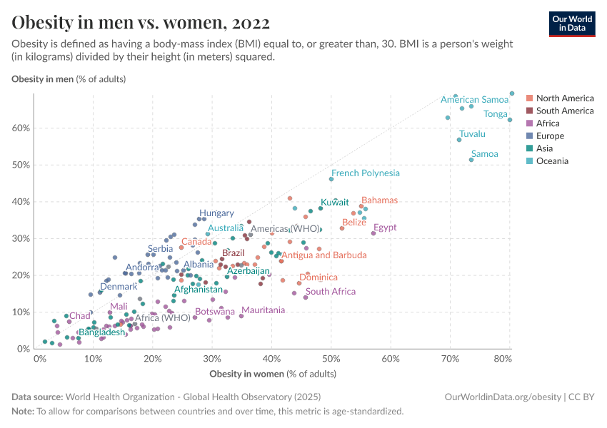 Overall we see a pattern roughly in line with prosperity: the prevalence of obesity tends to be higher in richer countries across Europe, North America, and Oceania. Obesity rates tend to be much lower across South Asia and Sub-Saharan Africa.