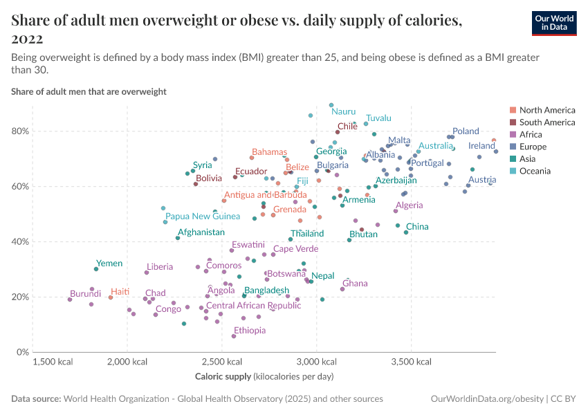 In the chart here, we see the relationship between the share of men who are overweight or obese versus the daily average supply of kilocalories per person.