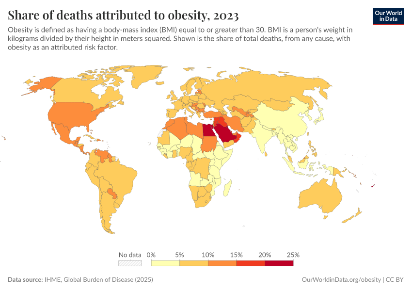 In 2019, in most high-income countries, the share of deaths attributed to obesity was in the range of 8 to 10%. In many middle-income countries, this share was almost twice as high.