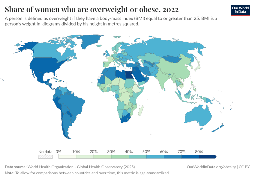 In the map here we see the share of adults who are overweight or obese across countries.