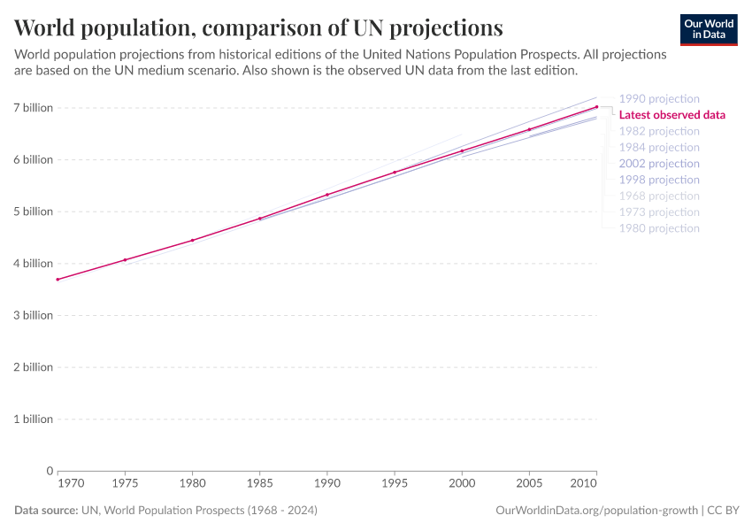 Here we look at UN reports dating back to 1968 – it was not possible to find earlier versions of UN reports. However, other studies note that projections in the 1950s had much larger error margins: they were often out by more than 10%.